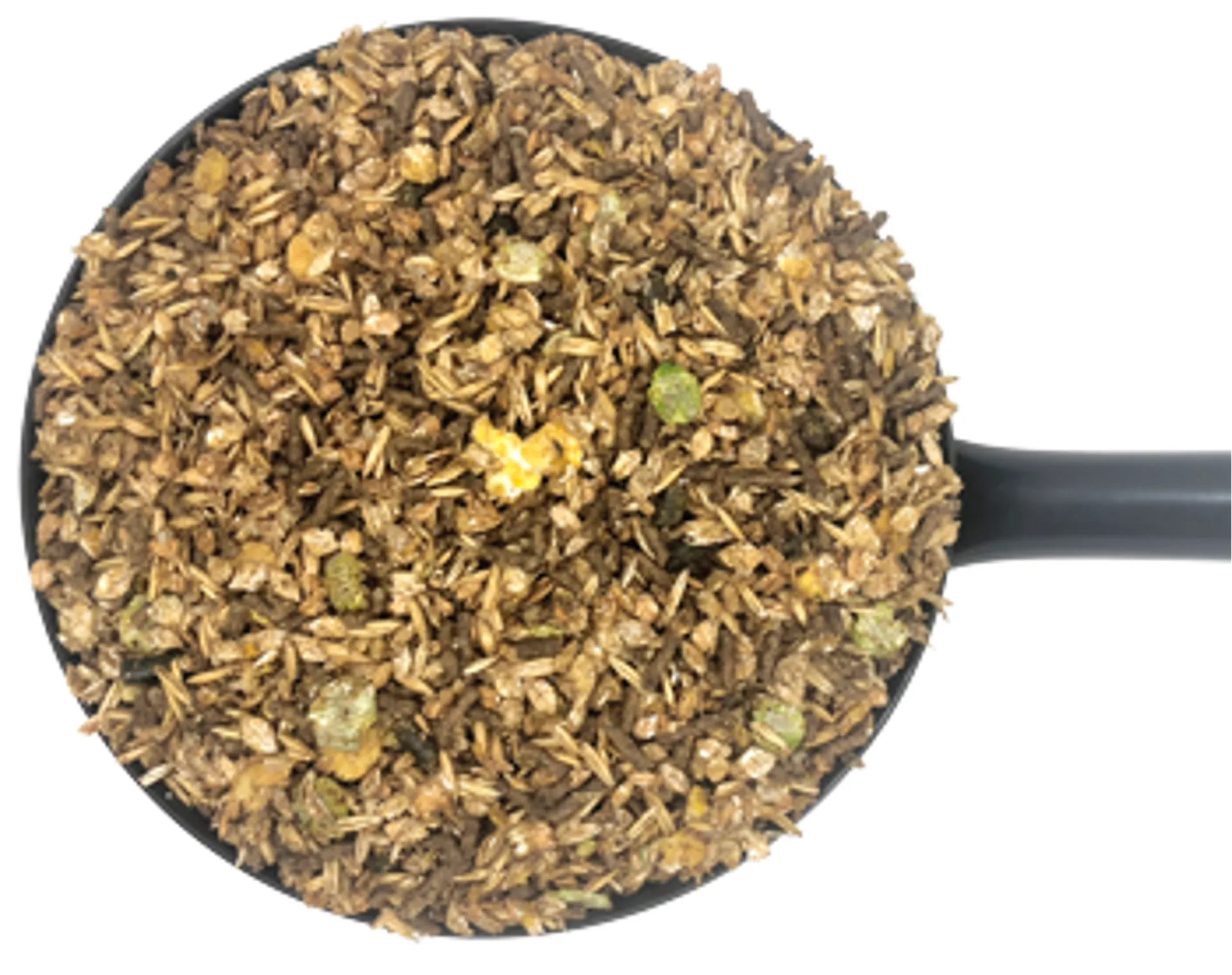 Composition: Oats, Flaked Barley, Wheatfeed, Flaked Wheat, Sunflower Seed Meal, Dehulled, Grass Meal, Molasses, Flaked Soya, Soya Ext, Micro Flaked Maize, Full Fat Linseed Meal, Linseed Expeller, Calcium Carbonate, Micro Flaked Peas, Dicalcium Phosphate, Dried Beet Pulp, Full Fat Soya, Sodium Chloride, Magnesium Oxide, Rapeseed Oil, Fructo-oligosaccharides, Mannan oligosaccharides, Basil, Mint, Soya Oil (produced from GM soya)
