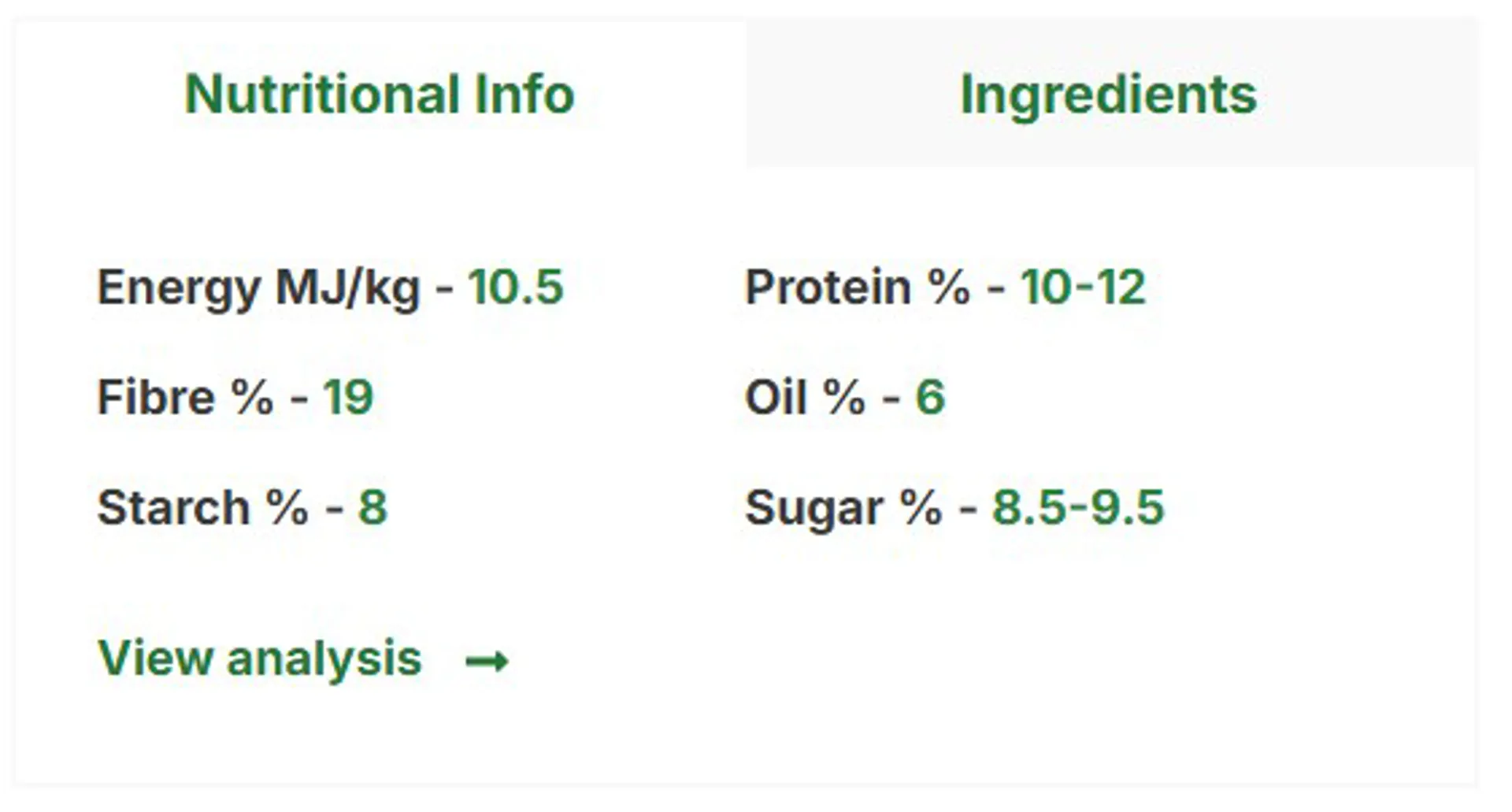 Straw, Alfalfa, Grass, Fibre Pellets, Molasses, Barley, Soya Flakes, Soya Oil, Mint, Yea-sacc®, Prebiotic, Broad Spectrum Vitamin and Mineral Supplement