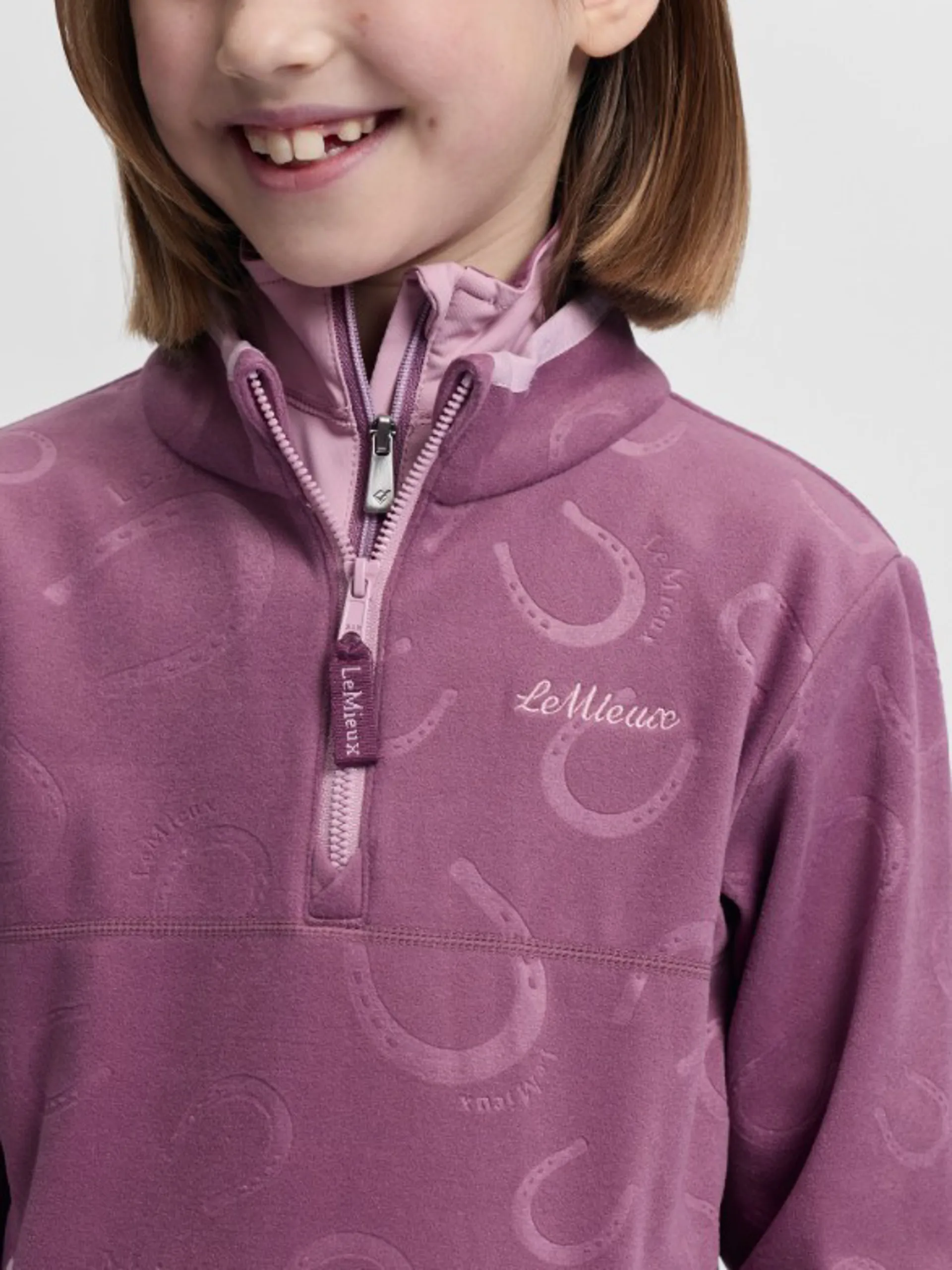 Fleece with debossed horseshoe print- Half zip with contrast lining- Contrast welt pockets and collar, hem and cuff bindingsDebossed all over with a cute, fun horseshoe print, this cosy fleece is the ideal mid layer to throw on when it gets a little chilly. The handy half zip makes for easy overhead changes, even with a helmet on - and the contrast welt pockets are the ideal place for Mini Riders to store treats and little treasures. Collar, hem and cuff bindings elevate this piece in terms of style and practicality.