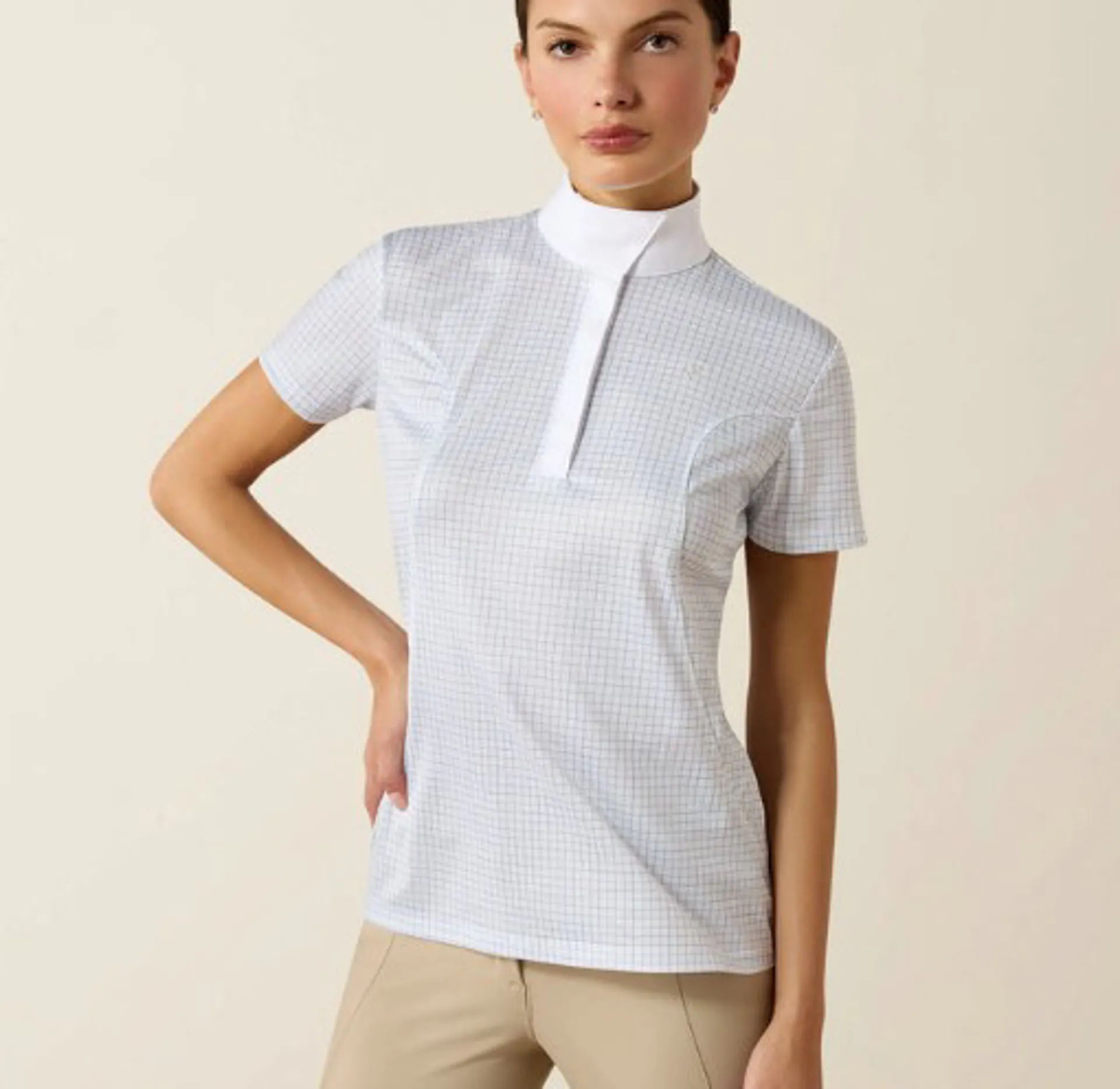 Crafted from cooling fabric that moves with you, this chic show shirt helps you perform at your best all season long. Great on its own or under a show jacket, it's a lightweight summer staple you'll reach for again and again.ClimateTEK™ dynamically responds to your body temperature to keep you cool when things heat upFreshTEK™ odour control helps keep you feeling fresh through long hours of wearMoisture Movement Technology™ helps wick moisture away from the skin to keep you dry and comfortableSun Protection Fabric™ helps block harmful UV rays, keeping you covered and comfortable during long days outdoorsWrap show collar with hidden snapsStock tie loopBuilt-in stretch for comfort and mobilityReceycled polyester and elastane piqueUPF 50+