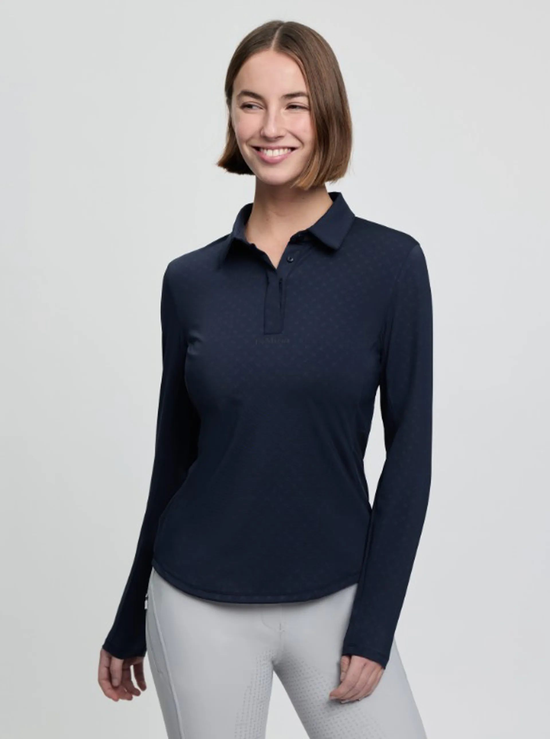Structured collar with concealed popper opening- UV50+ protection- Finer fabric under the arms and through the side bust with ventilation- Generous cut through the body- Curved hem for tucking in or out- Debossed print on Navy option matches seat grip silicone print on Isabelle Breech
