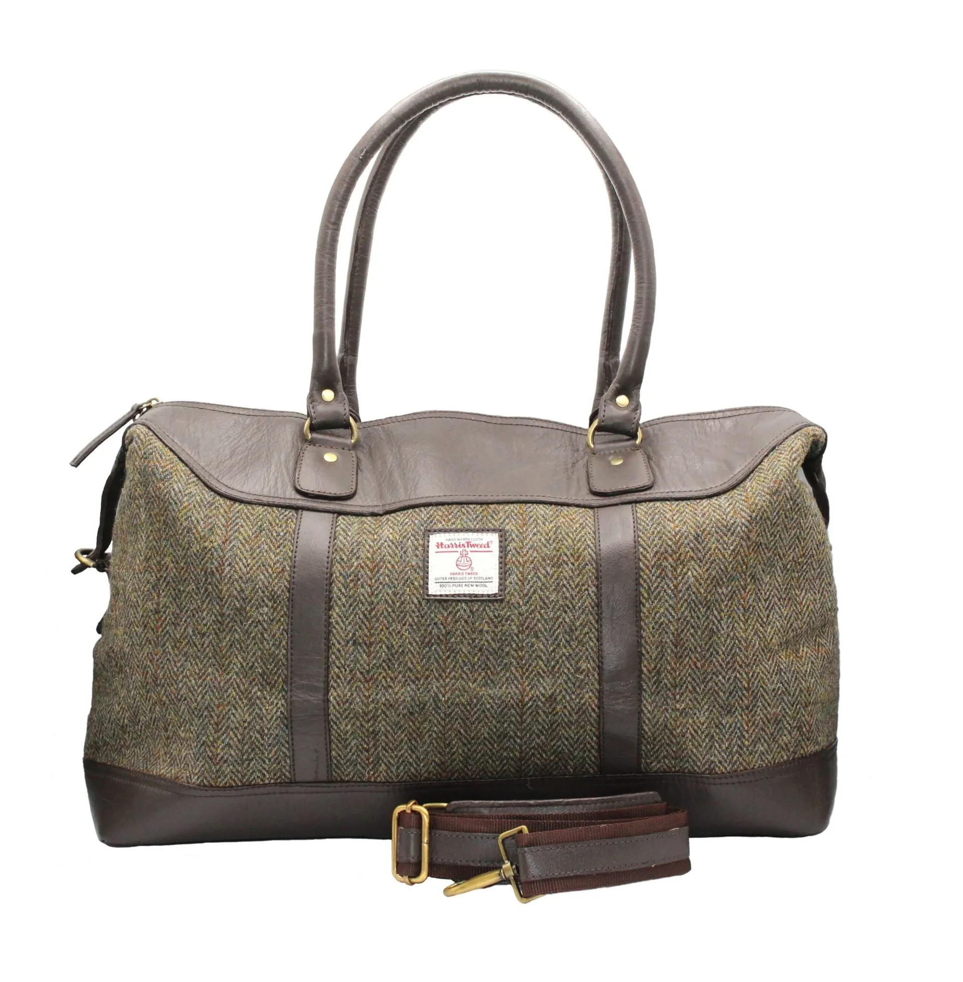 High quality Harris Tweed travel bag trimmed with Genuine Leather. Detachable shoulder straps and outer zipped security pocket. Inner pockets. Fully lined. 50cm wide x 35cm tall x 26cm deep