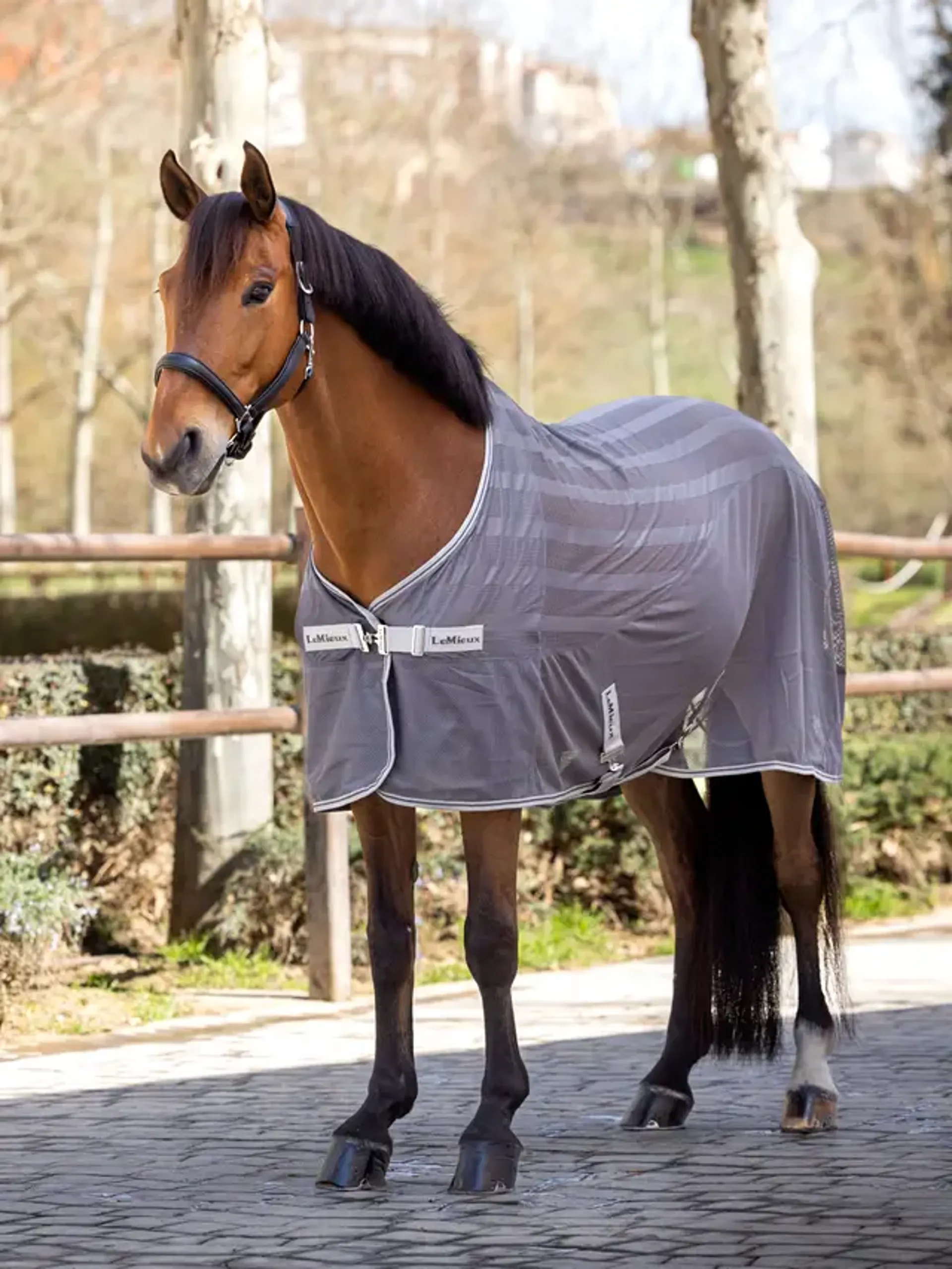 This lightest mesh sheet offers maximum cooling with minimal weight, designed for the warmest conditions. Linear cooling strips alternate open-weave mesh and 3D mesh for structural integrity with cooling respite along the body.The rich mid-grey colorway, contrasting with light grey jacquard webbing, and LeMieux wordmark detailing, means your horse can look its best even in the hottest weather.Delivering a whole-body cooling effect, the stretch-lined chest has a sturdy yet lightweight T-bar front closure, adjustable for optimum fit. Adjustable crossed surcingles and a soft cord fillet string ensure you can comfortably fit the rug close to your horse’s body for the maximum cooling effect.