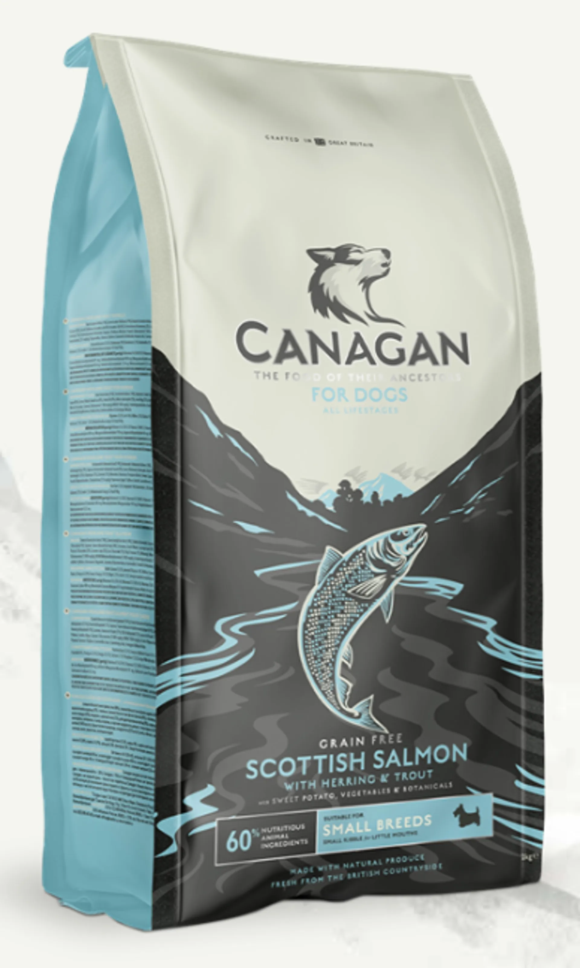 Grain free dog food, made with a smaller kibble, with freshly prepared Scottish salmon, boosted with protein-rich herring, trout and white fish. Crafted with specially selected vegetables and botanicals to match your dog's ancestral diet.